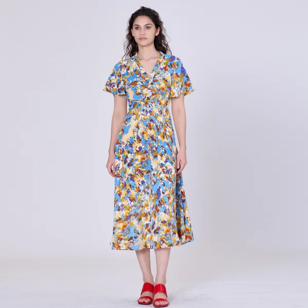 Een dynamisch en multicolor stuk dat elk type silhouet past. Twee lang gedrapeerde panelen beginnen vanaf de bovenkant van de buste en kruisende paden vooraan en vastgebonden aan de achterkant: een originele structuur die slim de taille benadrukt. Korte wijd uitlopende mouwen en wijd uitlopende rok. Een sierlijk silhouet dat geschikt is voor semi-formele gelegenheden zoals een brunch, een tuinfeest of zelfs om een voorjaarsbruiloft bij te wonen. Productdetails: Lengte: 122 cm Model draagt maat 10 Modelhoogte is 5 "7 Vorm: fit-and-flare Korte mouwen V halslijn