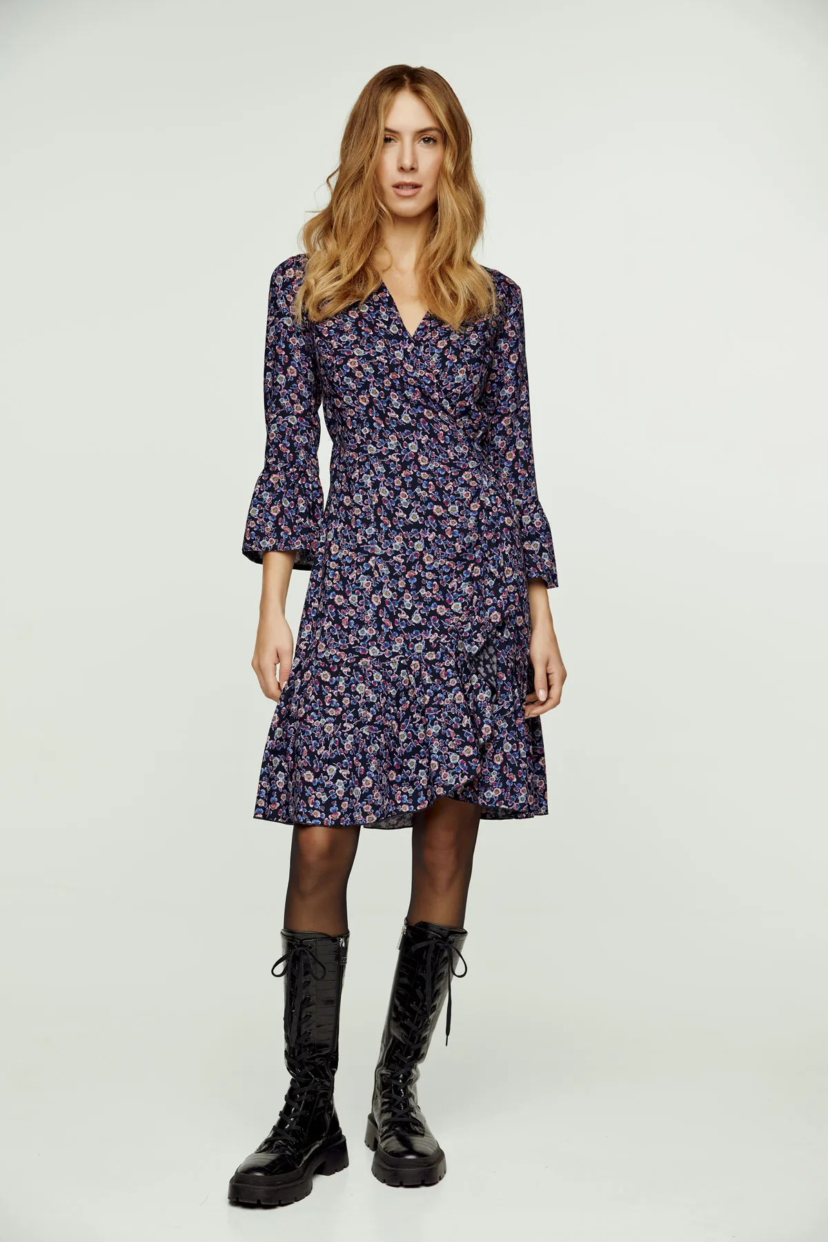Deze wikkeljurk met bloemenprint is gemaakt van geweven viscose. Hij heeft een V-hals en 3/4 klokmouwen. Deze wikkeljurk heeft een das aan de linkerkant die door een gat aan de rechterkant gaat en die met de rechter das aan de zijkant of aan de achterkant wordt vastgemaakt. In de zoom zit een ruche van ongeveer 15 cm