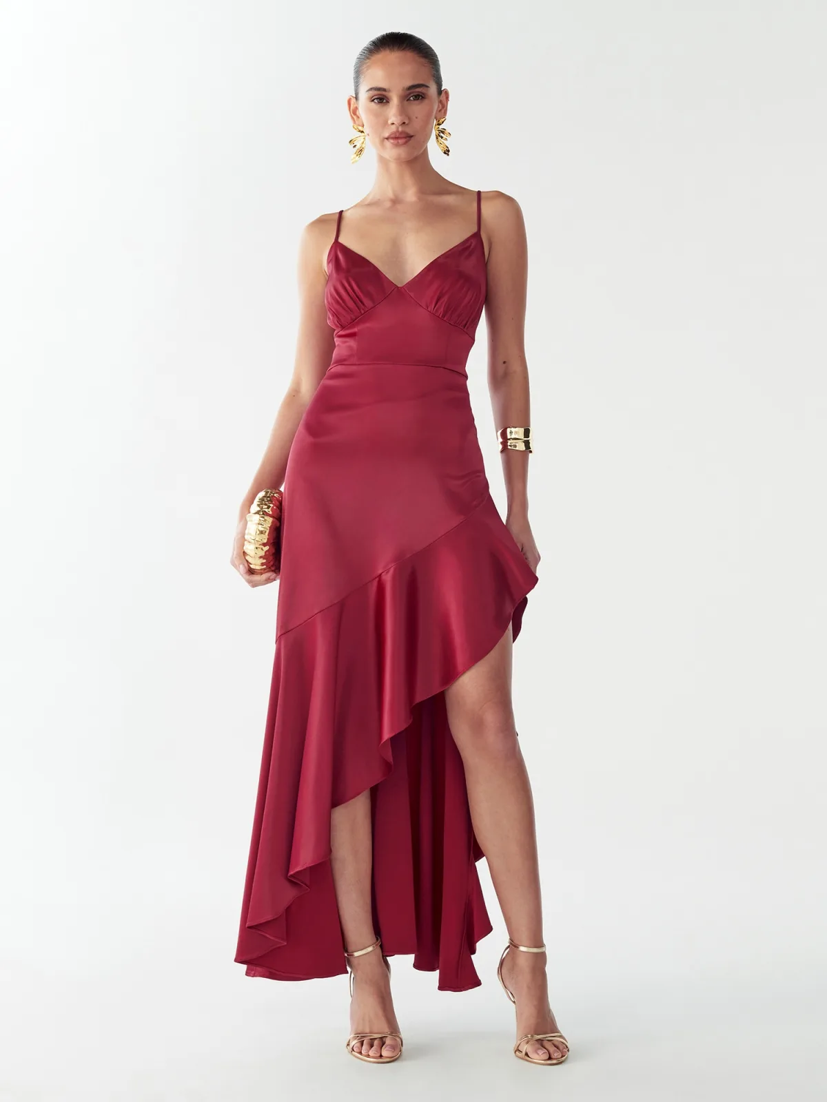 Type sluiting: Ritssluiting; Halstype: V-hals; Motief: Effen; Soort bandjes: Spaghettibandjes; Details: Volant; Extra's: Op staal naden; Lengte: Lang/maxi; Snit: Getailleerd; Pasvorm: Slanke pasvorm; Armlengte: Mouwloos