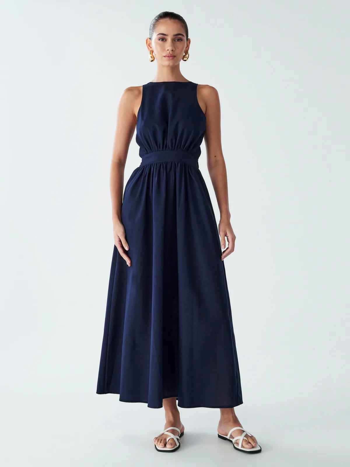 Design: Tailleband, Om te knopen/binden; Materiaal: Katoen; Halstype: Open rug; Motief: Effen; Soort bandjes: Normale bandjes; Details: Cut-outs, Gedrapeerd; Extra's: Lichte stof; Lengte: 7/8 lengte; Snit: Getailleerd; Pasvorm: Normale pasvorm; Armlengte: Mouwloos