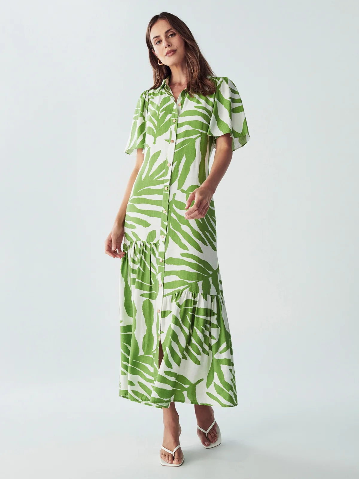 Design: Knop placket; Type sluiting: Knoopsluiting; Materiaal: Katoen; Motief: Bloemenprint; Kraag: Kentkraag; Details: Volant, Gedrapeerd; Extra's: All-over patroon; Lengte: 7/8 lengte; Snit: Getailleerd; Pasvorm: Normale pasvorm; Armlengte: Kwartmouw