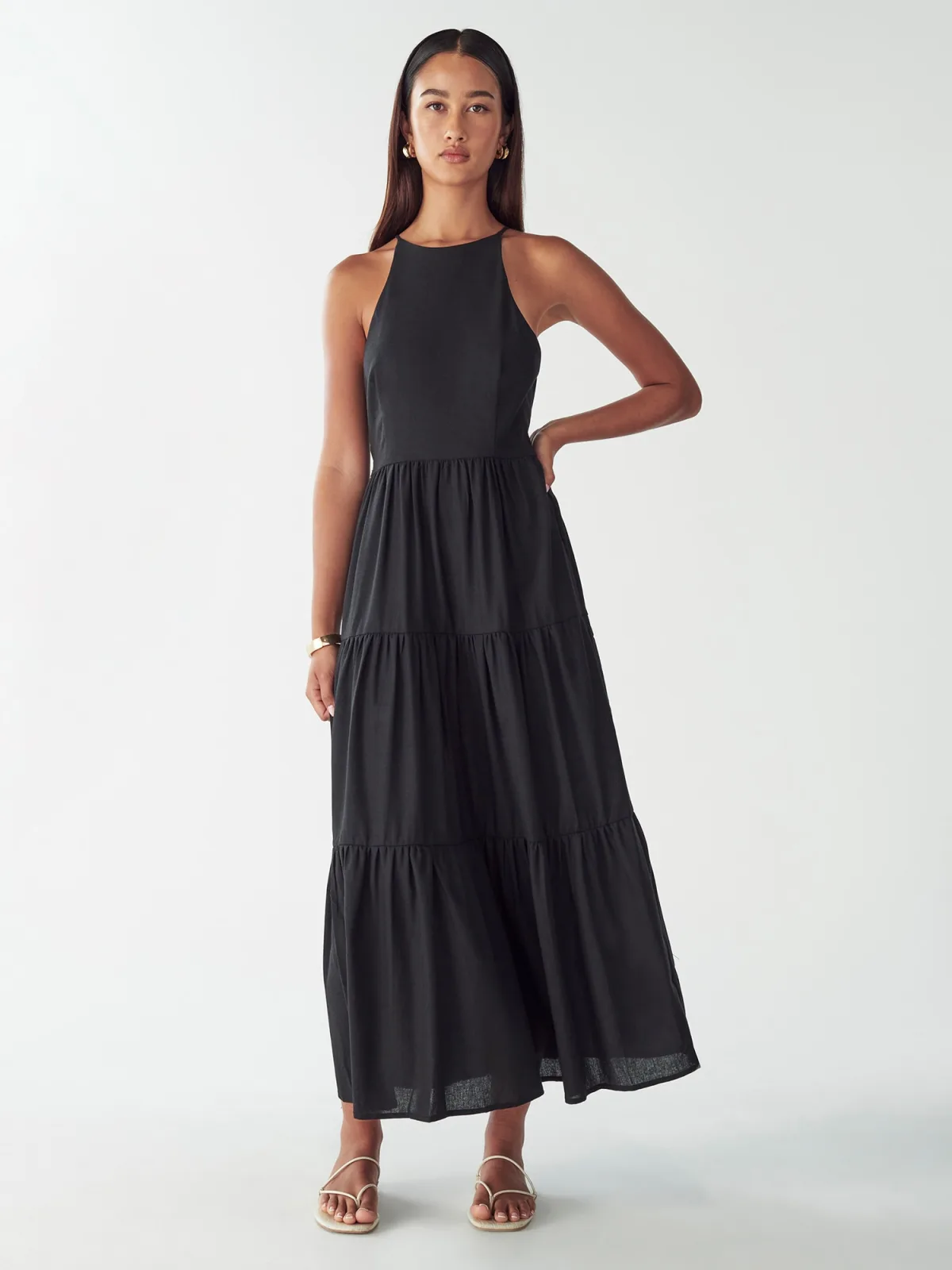 Design: Gevoerde zoom/rand; Type sluiting: Ritssluiting; Materiaal: Linnen; Halstype: Ronde hals; Motief: Effen; Details: Volant; Extra's: Op staal naden; Lengte: 7/8 lengte; Snit: Getailleerd; Pasvorm: Normale pasvorm; Armlengte: Mouwloos