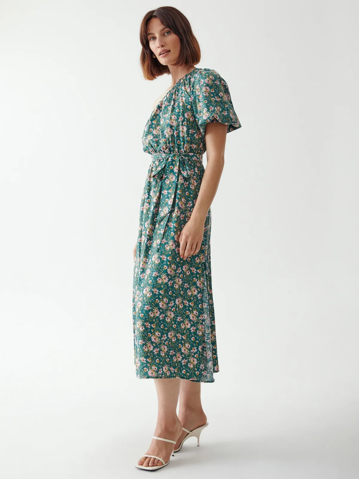 Design: Pofmouwen, Strapless/off-shoulder, Tailleriem; Materiaal: Viscose; Halstype: Open rug; Motief: Bloemenprint; Soort bandjes: One-shoulder; Details: Gedrapeerd; Extra's: All-over patroon; Lengte: 3/4 lengte; Pasvorm: Normale pasvorm; Armlengte: Kwartmouw