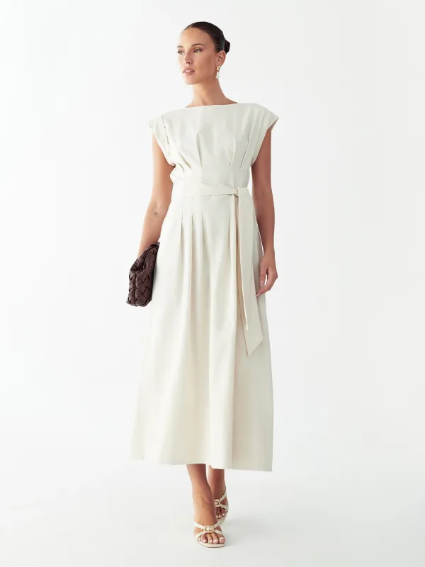 Design: Tailleriem; Type sluiting: Ritssluiting; Materiaal: Katoen; Halstype: Ronde hals; Motief: Effen; Details: Plooien; Extra's: Op staal naden; Lengte: 7/8 lengte; Snit: Uitlopend; Pasvorm: Normale pasvorm; Armlengte: Kwartmouw