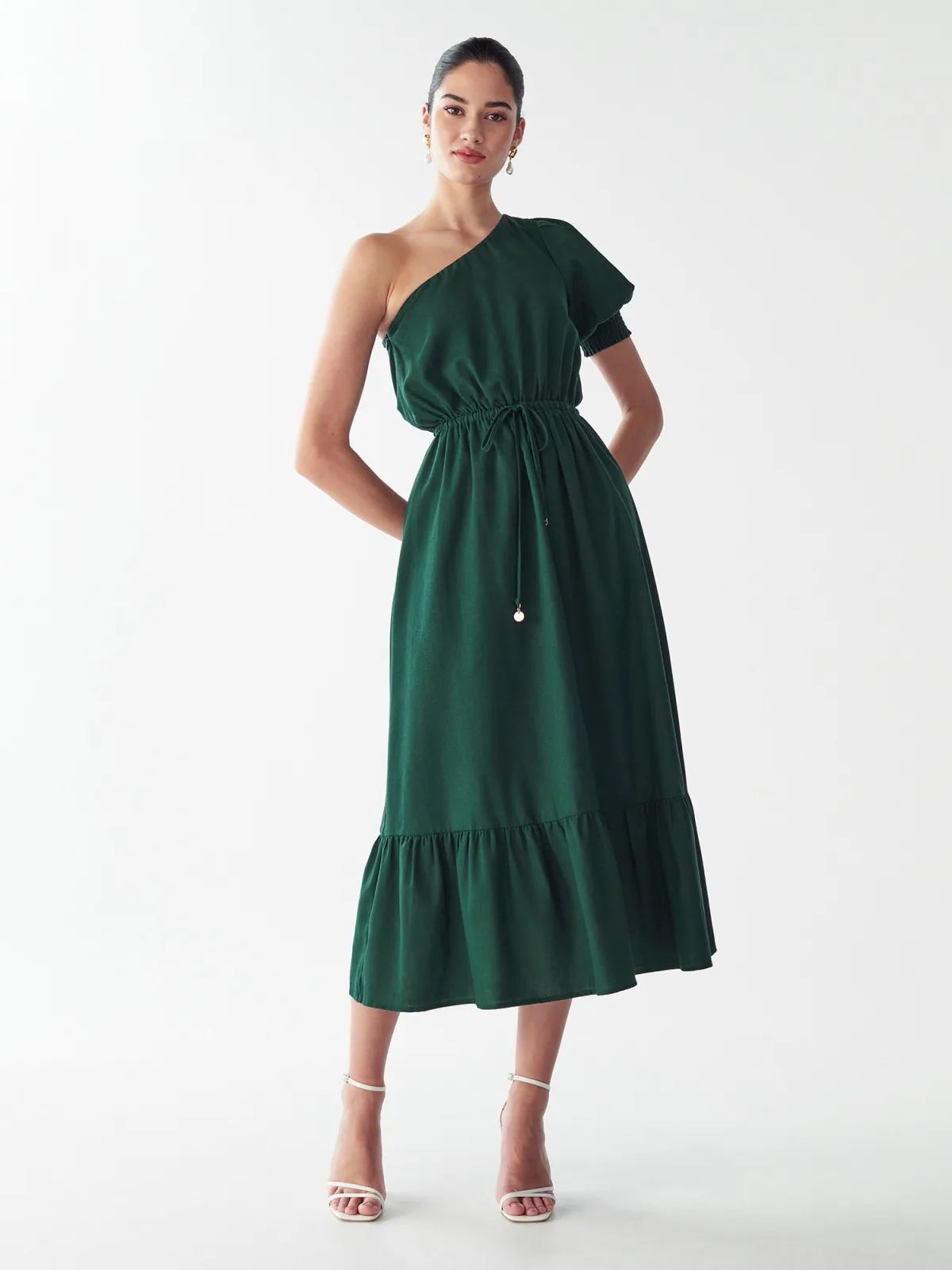 Design: Gevoerde zoom/rand; Materiaal: Linnen; Motief: Effen; Soort bandjes: One-shoulder; Details: Volant, Gedrapeerd; Extra's: Op staal naden, Voelt zacht aan; Lengte: Lang/maxi; Pasvorm: Normale pasvorm; Armlengte: Halve mouw