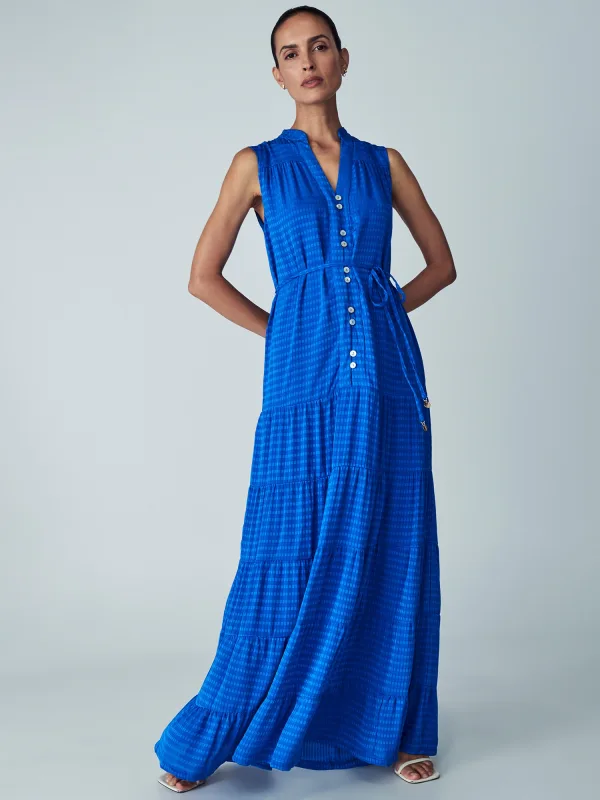 Design: Diepe snit/decolleté; Type sluiting: Knoopsluiting; Motief: Geruit; Kraag: Tuniek kraag; Details: Volant, Gedrapeerd; Extra's: All-over patroon; Lengte: Lang/maxi; Snit: Getailleerd; Pasvorm: Losse pasvorm; Armlengte: Mouwloos