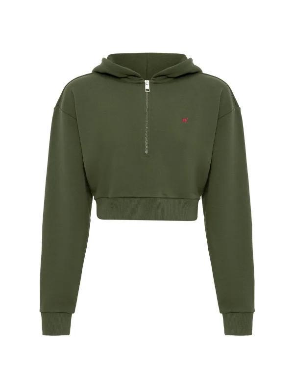 Design: Elastische taille/zoom, Extra lange mouwen, Met capuchon, Halve rits; Type sluiting: Ritssluiting; Materiaal: Sweatstof; Halstype: Capuchon; Motief: Effen; Details: Borduursels; Extra's: Label borduurwerk, Op staal naden, Voelt zacht aan; Pasvorm: Losse pasvorm; Armlengte: Lange mouw; Lengte: Korte pasvorm