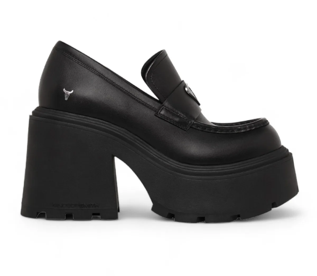 Deze chunky platform schoenen brengen gedurfdheid en stijl naar je garderobe. Versierd met het iconische Windsor Smith bull logo in metalen details, hebben ze een loafer ontwerp met een moderne twist. De lichte geprofileerde zool en hoge hak maken deze schoenen een uitstekende keuze voor zelfverzekerde, edgy looks. Zwarte leren bovenwerk Chunky hoog-hak platform ontwerp Windsor Smith logo op metalen plaat Bull symbool op bovenwerk Ronde neus Lichte chunky geprofileerde T.P.R platform zool Hakhoogte: 12 cm Platformhoogte: 5.3 cm