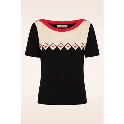 ''Hello sweetheart!'' Deze comfy knitted cutie heeft een hoge halslijn, korte pofmouwtjes, een hartjes en ruitpatroon op de voorzijde en is afgewerkt met rode accenten. Ze is uitgevoerd in een heerlijk soepele, fijngebreide en stretchy zwarte en crème gekleurde viscosemix, waardoor ze heerlijk draagt. * Hoge halslijn * Korte pofmouwtjes * Stretchy ribboord * Lang genoeg om op een normale heupbroek te dragen