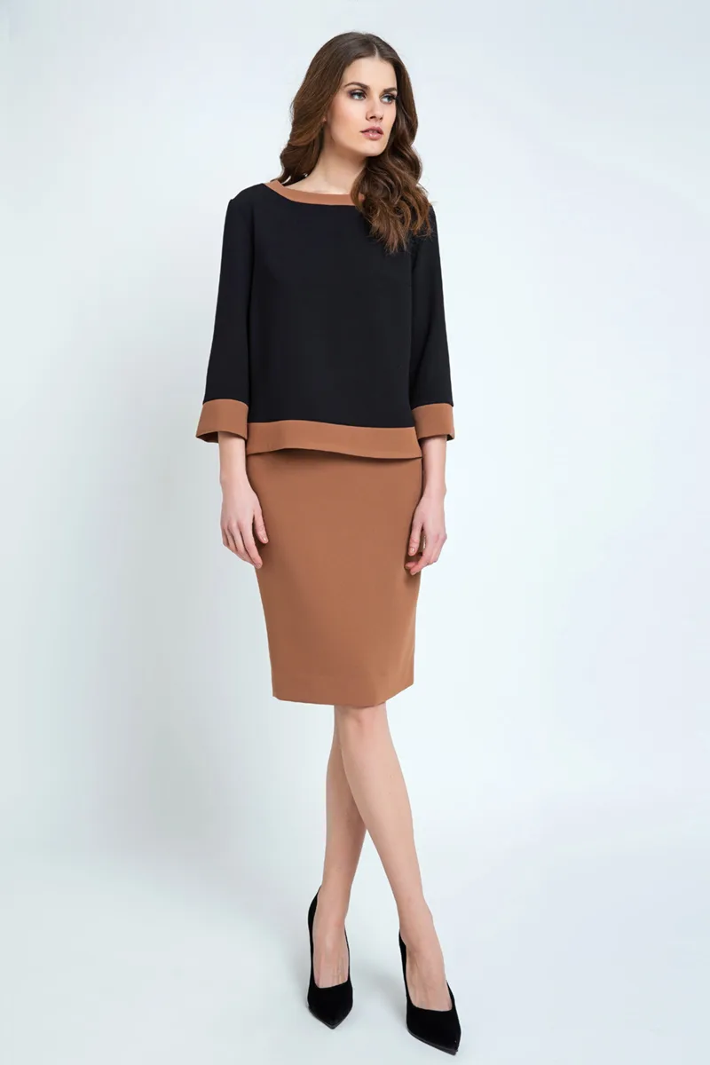 Winterkokerrok van geweven stof met een lichte stretch. Tailleband in dezelfde stof. 2 plooien onder de tailleband vooraan en achteraan. Gouden ritssluiting van 20 cm achteraan. Gevoerd. Lengte voor maat 38: 65cm. Extra stof aan de zoom maakt het mogelijk om het tot 4,5cm te laten zakken.Ons model is 178cm en draagt maat 36.