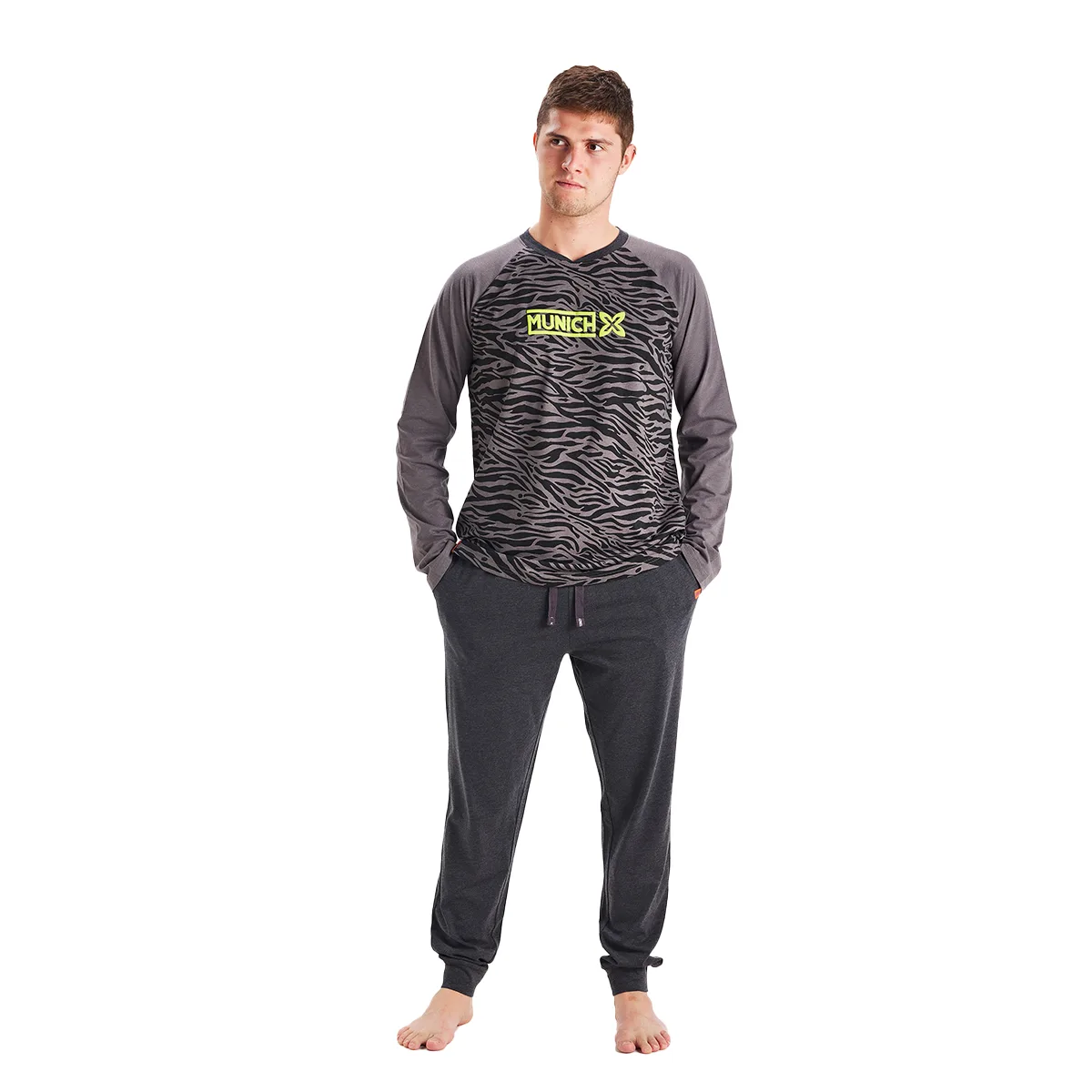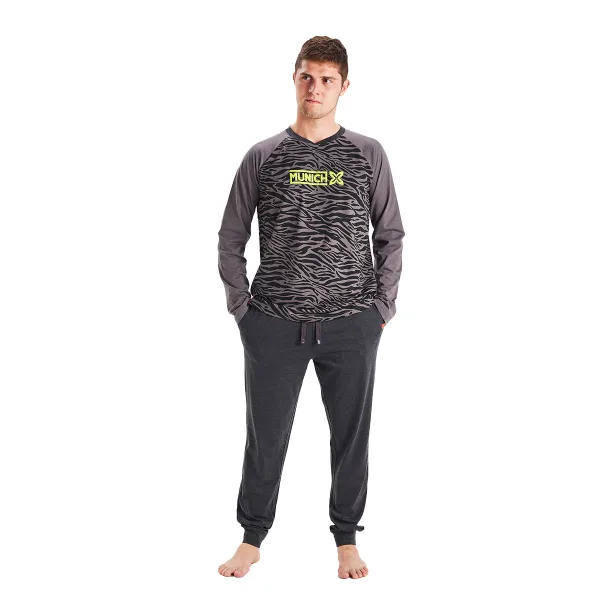 Ontdek het comfort en de elegantie van de herenpyjama Munich. Deze pyjama is perfect om te genieten van koude nachten met een vleugje verfijning. De zachte textuur zorgt voor uitzonderlijke warmte, ideaal om thuis te ontspannen. De set bestaat uit een T-shirt met lange mouwen dat opvalt door zijn moderne design, versierd met elegant borduursel met de merknaam. De broek heeft ook een elastische tailleband die verstelbaar is met een trekkoord, voor een perfecte pasvorm en bewegingsvrijheid. Ze zijn ook ontworpen met praktische zijzakken, ideaal om je essentials in mee te nemen terwijl je geniet van momenten van ontspanning. De elastische manchetten van de broek zorgen voor extra stijl en comfort en houden de broek op zijn plaats. Samenstelling: T-shirt: 60% Polyester, 40% Katoen; Broek: 60% Polyester, 40% Katoen Onderhoud: - Wassen op een zacht programma. - Gebruik altijd koud of warm water. - Gebruik geen droger. Het is beter om aan de lucht te drogen. - Indien nodig op lage temperatuur strijken. - Gebruik geen bleekmiddel.