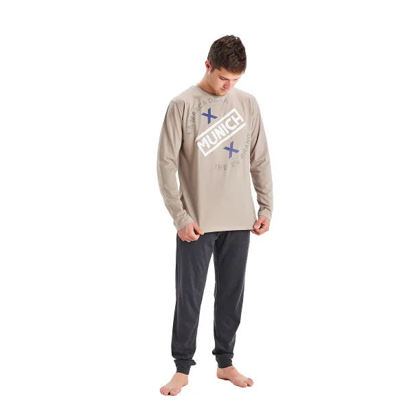 Ontdek het comfort en de elegantie van de herenpyjama Munich. Deze pyjama is perfect om te genieten van koude nachten met een vleugje verfijning. De zachte textuur zorgt voor uitzonderlijke warmte, ideaal om thuis te ontspannen. De set bestaat uit een T-shirt met lange mouwen dat opvalt door zijn moderne design, versierd met elegant borduursel met de merknaam. De broek heeft ook een elastische tailleband die verstelbaar is met een trekkoord, voor een perfecte pasvorm en bewegingsvrijheid. Ze zijn ook ontworpen met praktische zijzakken, ideaal om je essentials in mee te nemen terwijl je geniet van momenten van ontspanning. De elastische manchetten van de broek zorgen voor extra stijl en comfort en houden de broek op zijn plaats. Samenstelling: T-shirt: 60% Polyester, 40% Katoen; Broek: 60% Polyester, 40% Katoen Onderhoud: - Wassen op een zacht programma. - Gebruik altijd koud of warm water. - Gebruik geen droger. Het is beter om aan de lucht te drogen. - Indien nodig op lage temperatuur strijken. - Gebruik geen bleekmiddel.