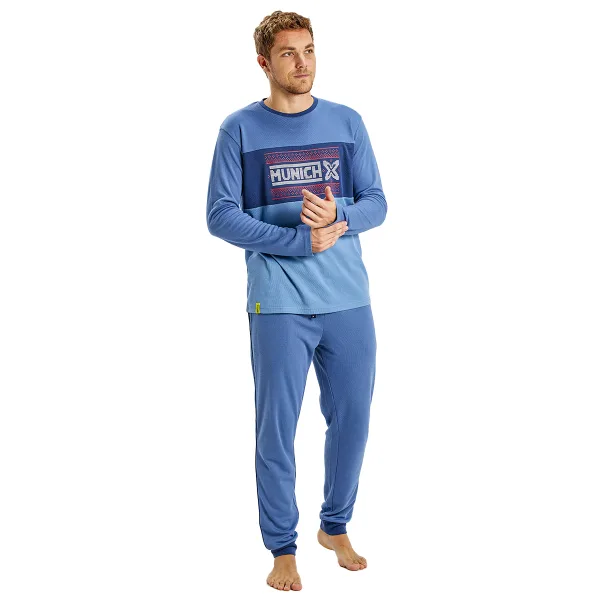 Munchen pyjama met lange mouwen. Kleur blauw T-shirt met lange mouwen en ronde hals. Ontwerp met merkafbeeldingen. Lange broek. Elastische tailleband. Rechte zomen. Naden in toon zichtbaar. Samenstelling: 60% Polyester, 40% Katoen. -Wassen op max. temperatuur. 30º. -Geen bleekmiddel gebruiken. -Strijken op max. temperatuur. 110º. -Niet geschikt voor stomerij. -Mag in de droger. Samenstelling: 60% Polyester, 40% Katoen. Onderhoud: -Wassen op max. temperatuur. 30º. -Geen bleekmiddel gebruiken. -Strijken op max. temperatuur. 110º. -Niet geschikt voor stomerij. -Je kunt wel een droger gebruiken.