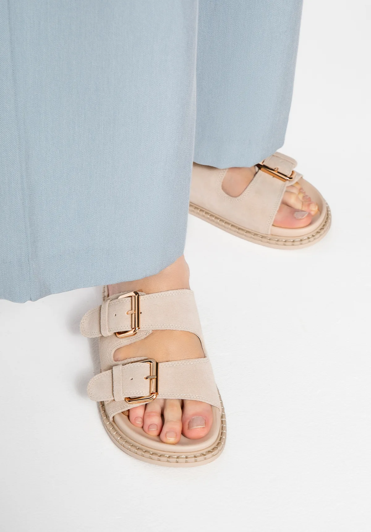 Suède slippers met verstelbare bandjes; stijl en comfort waar je dol op zult zijn! De zomer kent zijn eigen regels, en deze slippers zijn daar de perfecte belichaming van! De combinatie van zacht suède, brede verstelbare bandjes en een tijdloos design maken ze een absolute must-have voor warme dagen. Dankzij het instapmodel trek je ze in een handomdraai aan en de platte hak houdt je de hele dag comfortabel, van je ochtendkoffie in je favoriete café tot lange avondwandelingen. Voor wie? Als je van stijl en comfort houdt, zijn deze damesschoenen perfect voor jou! Perfect voor vrouwen die mode belangrijk vinden, maar niet willen inleveren op comfort. Ze passen bij elke outfit, van lichte jurken en klassieke jeans tot elegante outfits voor zomeravonden. Ons advies: kies voor natuurlijke materialen en lichte stijlen! Combineer ze met een geweven schoudertas, een soepele linnen jurk en delicate sieraden voor de perfecte zomerlook. Liever iets casuals? Combineer ze met een short, een heuptasje en een oversized shirt; comfort en stijl op hun best! Belangrijkste kenmerken: Materiaal: Zacht suède leer zorgt voor duurzaamheid en een perfecte pasvorm. Platte hak: Perfect voor lange wandelingen, biedt comfort zonder in te leveren op elegantie. Ontwerp: Een open, amandelvormige neus accentueert je voeten subtiel en voegt een vleugje lichtheid toe aan elke outfit. Instapper: Snel en gemakkelijk aan te trekken, perfect voor dagen vol spontane avonturen. Comfortabele en functionele kenmerken: Aanpasbaar: Twee verstelbare bandjes met gespen zorgen ervoor dat je de slippers perfect aan je voet kunt aanpassen, voor een stabiele pas, de hele dag lang. Comfort: Zachte voering en binnenzool garanderen een comfortabel gevoel, zelfs na urenlang lopen. TPR-zool: Lichtgewicht, slijtvast en biedt uitstekende grip voor optimaal comfort bij elke stap. Stijl, comfort en veelzijdigheid; deze schoenen zijn de perfecte zomerschoen! Voeg ze toe aan je winkelwagen en voel het verschil aan je voeten! Echt leer, synthetisch materiaal, synthetisch materiaal