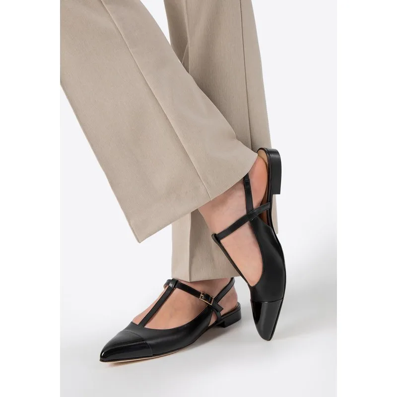 Elegantie en comfort in één: leren ballerina's met bandjes. Deze unieke ballerina's zijn een mix van klassiek en modern. Ze zijn volledig vervaardigd van echt leer en bieden uitstekend comfort. Het matte en lakleer contrasteren subtiel, wat ze een verfijnd karakter geeft. De puntige neus maakt de voet visueel slanker, terwijl delicate gespbandjes zorgen voor een perfecte pasvorm. De open teen en platte hak combineren comfort met elegantie, perfect voor zowel dagelijks gebruik als speciale gelegenheden. Voor wie zijn deze schoenen? Als je waarde hecht aan comfort, maar niet wilt inleveren op stijl, dan zijn deze schoenen iets voor jou. Ze zijn de perfecte keuze voor liefhebbers van klassieke elegantie met een moderne twist. Ze passen goed bij zowel dagelijkse outfits als als alternatief voor stiletto's voor speciale gelegenheden. Onze tip: Deze ballerina's passen prachtig bij elegante en casual outfits. Draag ze met een klassieke kokerjurk of sigarettenbroek en een overhemd voor op kantoor. Een leren schoudertas of clutch is de perfecte aanvulling. Belangrijkste kenmerken: Materiaal: Zacht en duurzaam echt leer garandeert een elegante look en hoog draagcomfort. Mat en lakleer: Voegt originaliteit toe en trekt de aandacht, waardoor het unieke ontwerp wordt benadrukt. Spitse neus: Maakt de voet visueel slanker en de benen langer, waardoor het silhouet een lichter silhouet krijgt. Open hiel: Voegt subtiele elegantie toe, waardoor deze schoenen ideaal zijn voor warme dagen. Platte hiel: Biedt dagelijks comfort, voorkomt voetvermoeidheid en garandeert comfort, zelfs tijdens lange wandelingen. Comfortabele en functionele kenmerken: Gespriemen: Garandeert stabiliteit en comfort, waardoor een verstelbare pasvorm mogelijk is. Binnenzool en voering: Echt leer zorgt voor zachtheid en past zich aan de voet aan, wat resulteert in een comfortabele pasvorm. Zool: Flexibel en duurzaam leer biedt comfortabel lopen en een stijlvolle afwerking. Deze leren ballerina's staan synoniem voor tijdloze elegantie en comfort. Bekijk ze en word verliefd op hun stijl! Echt leer, echt leer, echt leer
