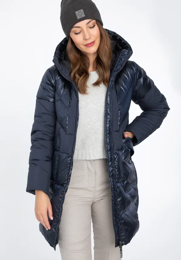 Damesjas met capuchon. Deze stijlvolle jas voegt een vleugje elegantie toe aan je winteroutfits. De combinatie van glanzend nylon en mat polyester creëert een uniek effect, aangevuld met geometrische stiksels. De open zakken aan de voorkant zijn een handige plek om je handen of kleine spullen in op te bergen. De capuchon is klein, maar beschermt je hoofd comfortabel tegen de kou. Je kunt deze stijl zowel naar je werk als erna dragen; hij staat geweldig met elegante laarzen of je favoriete plateauschoenen. Deze damesjas met capuchon, gemaakt van een combinatie van materialen, trekt de aandacht en voegt een vleugje glamour toe aan je dagelijkse look. Onze tip: dit is een geweldige jas voor elke dag. Materiaal 1: 100% polyester; Materiaal 2: 100% nylon; Vulling: 70% eendendons, 30% eendenveren; Voering: 100% polyester; met een vaste capuchon; twee open zakken; ritssluiting; zijsplitten.