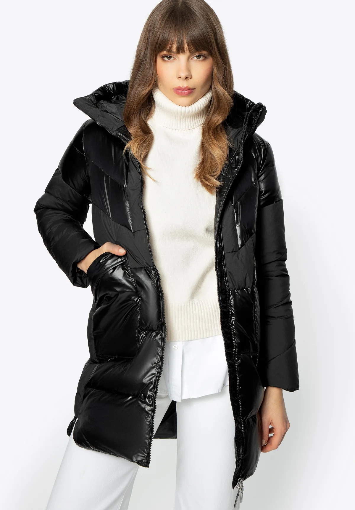 Damesjas met capuchon. Deze stijlvolle jas voegt een vleugje elegantie toe aan je winteroutfits. De combinatie van glanzend nylon en mat polyester creëert een uniek effect, aangevuld met geometrische stiksels. De open zakken aan de voorkant zijn een handige plek om je handen of kleine spullen in op te bergen. De capuchon is klein, maar beschermt je hoofd comfortabel tegen de kou. Je kunt deze stijl zowel naar je werk als erna dragen; hij staat geweldig met elegante laarzen of je favoriete plateauschoenen. Deze damesjas met capuchon, gemaakt van een combinatie van materialen, trekt de aandacht en voegt een vleugje glamour toe aan je dagelijkse look. Onze tip: dit is een geweldige jas voor elke dag. Materiaal 1: 100% polyester; Materiaal 2: 100% nylon; Vulling: 70% eendendons, 30% eendenveren; Voering: 100% polyester; met een vaste capuchon; twee open zakken; ritssluiting; zijsplitten.