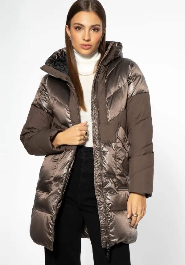 Damesjas met capuchon. Deze stijlvolle jas voegt een vleugje elegantie toe aan je winteroutfits. De combinatie van glanzend nylon en mat polyester creëert een uniek effect, aangevuld met geometrische stiksels. De open zakken aan de voorkant zijn een handige plek om je handen of kleine spullen in op te bergen. De capuchon is klein, maar beschermt je hoofd comfortabel tegen de kou. Je kunt deze stijl zowel naar je werk als erna dragen; hij staat geweldig met elegante laarzen of je favoriete plateauschoenen. Deze damesjas met capuchon, gemaakt van een combinatie van materialen, trekt de aandacht en voegt een vleugje glamour toe aan je dagelijkse look. Onze tip: dit is een geweldige jas voor elke dag. Materiaal 1: 100% polyester; Materiaal 2: 100% nylon; Vulling: 70% eendendons, 30% eendenveren; Voering: 100% polyester; met een vaste capuchon; twee open zakken; ritssluiting; zijsplitten.