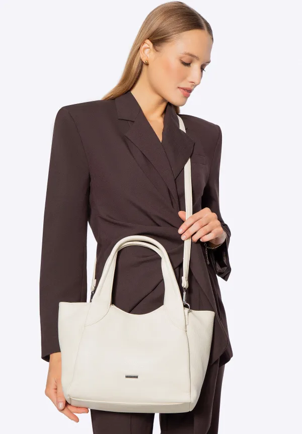 Kleine tas met afneembare riem. Elegantie in een compact formaat; deze tas van eco-leer combineert stijl en functionaliteit. Dankzij de compacte afmetingen is hij een perfecte aanvulling op je dagelijkse outfit, terwijl je toch al je essentials kwijt kunt. Het klassieke ontwerp en de zorgvuldige afwerking maken hem tot een handtas die je gemakkelijk kunt aanpassen aan verschillende gelegenheden. Twee handvatten en een afneembare, verstelbare riem zorgen voor comfortabel dragen, zowel in de hand als over de schouder. Voor wie is deze tas? Dit is een uitstekende keuze voor vrouwen die op zoek zijn naar een kleine maar elegante tas voor een avondje uit, een feestje of om te winkelen. Het formaat voldoet perfect aan de behoeften van vrouwen die de voorkeur geven aan lichte, functionele accessoires. Onze tip: De tas combineert prachtig met elegante enkellaarsjes met hak of stijlvolle loafers. Hij past perfect bij zowel formele als casual outfits en voegt een vleugje klasse toe. Belangrijkste kenmerken: Materiaal: Eco-leer, dat duurzaam, gemakkelijk te onderhouden is en zijn elegante uitstraling lang behoudt. Twee handvatten: Dankzij dit klassieke ontwerp kun je de tas comfortabel in de hand dragen en voegt hij stijl toe aan elke outfit. Perfect voor elegante gelegenheden waarbij je wilt dat je tas een subtiel maar toch onderscheidend accessoire is. Fabrikantlogo op de voorkant: Een subtiel detail dat karakter toevoegt en het model onderscheidt. Ruim interieur: Een ritsvak en een open vak voor het opbergen van je belangrijkste spullen: telefoon, sleutels of portemonnee. Samenstelling: 100% eco-leer; voering: 100% polyester. Comfortabele en functionele kenmerken: Draagcomfort: Een afneembare, verstelbare riem zorgt ervoor dat je de tas aan verschillende stijlen kunt aanpassen. Veiligheid: De rits zorgt ervoor dat je spullen altijd op hun plaats en goed beveiligd zijn. Investeer in deze charmante koffer en geniet elke dag van zijn elegantie en functionaliteit!