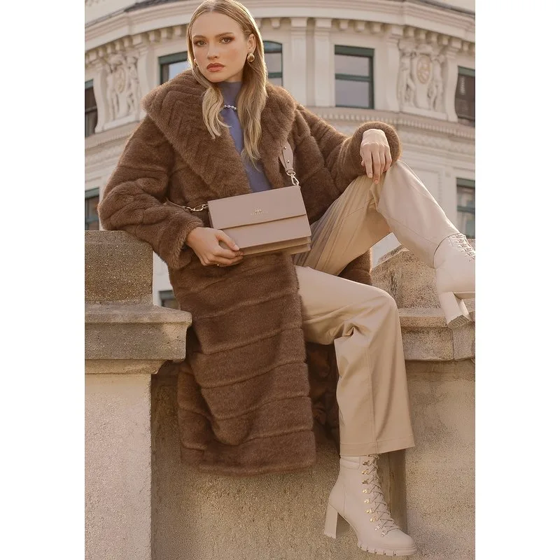 Imitatiebont – een hit van de laatste seizoenen. Onze imitatiebontjas, gewaardeerd door zowel modeliefhebbers als mensen die op zoek zijn naar functionele bovenkleding, combineert een luxueuze look met een ethische benadering van mode en biedt een elegante stijl zonder compromissen. De eenvoudige, relaxte snit biedt talloze stylingmogelijkheden, van elegant tot casual. De jas heeft een verborgen haak-en-oogsluiting aan de binnenkant, waardoor de geribbelde textuur van de jas goed tot zijn recht komt, terwijl twee praktische zijzakken al je essentials opbergen. De bontkraag is royaal en omhullend, wat zorgt voor extra warmte en een verfijnde uitstraling. De strepen op de bontkraag creëren effectieve, horizontale lijnen en voegen een modern, gestructureerd karakter toe. Voor wie: Dit is de perfecte keuze voor vrouwen die van elegantie en tijdloze chic houden, maar ook oog hebben voor het milieu. Hij is ook geschikt voor modeliefhebbers die met hun outfit de aandacht willen trekken en zich willen onderscheiden van de massa. Onze tip: Combineer een damesbontjas met een klassieke zwarte jurk en laarzen tot aan de dijen. Combineer met opvallende sieraden en een spectaculaire clutch voor een chique avondlook. Draag hem dagelijks met een jeans en enkellaarsjes voor een modieuze maar comfortabele look. Belangrijkste kenmerken: Luxe materiaal: Hoogwaardig imitatiebont, zeer zacht en aangenaam om aan te raken, is een perfecte imitatie van bont. Functionaliteit: Een imitatiebontjas is praktisch omdat het warmte biedt op koudere dagen. Elegante snit: Het heeft een klassiek, eenvoudig ontwerp dat bij elk figuur past. Comfort: De losse pasvorm zorgt voor bewegingsvrijheid en de zachte voering verhoogt het comfort. Onderhoudsvriendelijk: Imitatiebont is gemakkelijk te onderhouden en vereist geen speciale verzorging. Samenstelling: Buitenmateriaal: 100% polyester; Voering: 45% viscose, 55% polyester. Dit is een antwoord op de behoeften van moderne vrouwen die elegantie willen combineren met een verantwoorde benadering van mode. Voeg deze unieke jas toe aan je garderobe en hul jezelf elke dag in luxe!