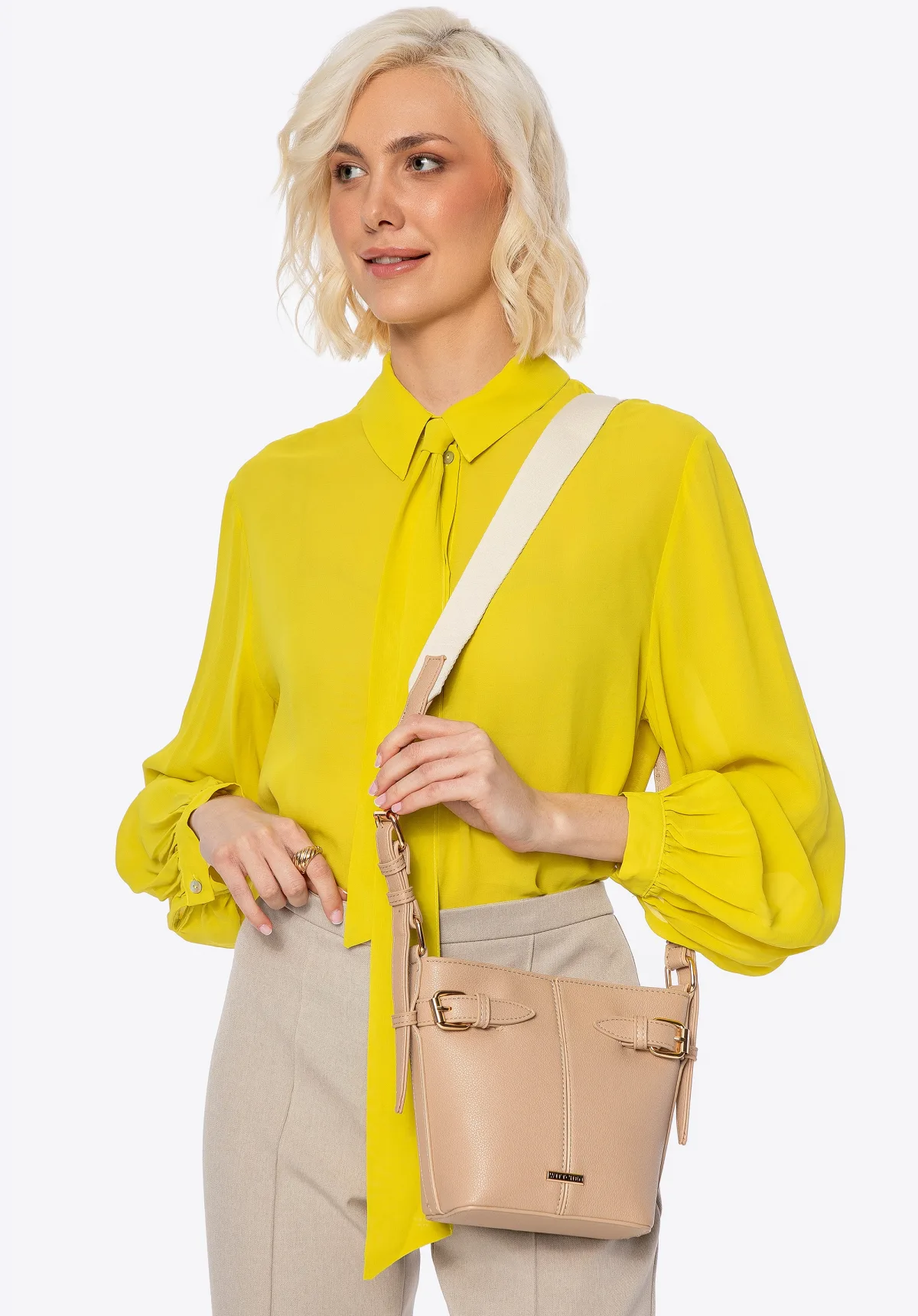 Stijlvolle bucket bag met een verstelbare handgreep en decoratieve schouderbanden. Deze bucket bag is gemaakt van eco-leer en is een must-have in je garderobe. Hij heeft een unieke boho-stijl en opvallende decoratieve schouderbanden aan de zijkanten. De verstelbare schouderband in een contrasterende kleur maakt de tas nog functioneler, zodat je hem kunt aanpassen aan je behoeften en stijl. De magnetische sluiting biedt snelle toegang tot het interieur, dat twee zakken heeft, waarvan één met een rits; perfect voor het opbergen van kleine spullen. Voor wie is deze tas? Perfect voor vrouwen die waarde hechten aan comfort en een modieuze dagelijkse look. Als je op zoek bent naar een tas die karakter toevoegt aan je dagelijkse outfits, dan zal deze tas zeker aan je verwachtingen voldoen. Onze tip: Deze tas combineert prachtig met klassieke loafers of platte sandalen, maar ook met vloeiende jurken met een patroon. Dit accessoire voegt een vleugje lichtheid en originaliteit toe aan je outfit. Belangrijkste kenmerken: Materiaal: Dankzij duurzaam eco-leer is de tas gemakkelijk te onderhouden en behoudt hij zijn elegante uitstraling lang. Functionele binnenkant: Twee zakken, waarvan één met een rits, zorgen ervoor dat je je spullen gemakkelijk kunt ordenen. Het ritsvak biedt veilige opbergruimte voor spullen zoals een portemonnee of telefoon. Decoratieve schouderbanden: Opvallend en geven de tas een uniek karakter. Magnetische sluiting: Biedt snelle toegang tot de inhoud en voorkomt dat de inhoud er per ongeluk uit valt. Samenstelling: 100% eco-leer; voering: 100% polyester. Comfortabele en functionele eigenschappen: Verstelbare schouderband in een contrasterende kleur: Dankzij het verstelbare ontwerp past de tas zich aan uw voorkeuren aan. Stevig ontwerp: Zorgt voor een onderscheidende vorm die de tas de hele dag in vorm houdt, zelfs als hij vol is. Kies voor onze bucket bag, die functionaliteit combineert met originaliteit!