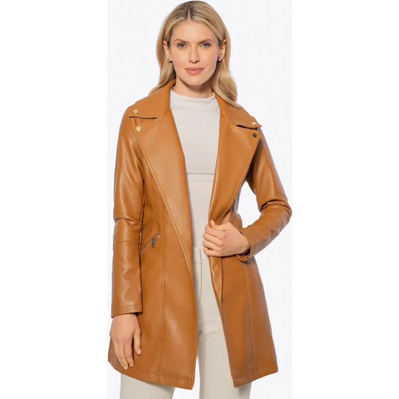 Jas die stijl definieert; elegantie en karakter in één! Metallic accenten, een perfecte snit en een tijdloos karakter; deze jas van eco-leer is een absolute must-have in je garderobe! De tailleband accentueert het silhouet perfect en twee praktische ritszakken zijn niet alleen een functioneel detail, maar geven de jas ook een moderne look. Het subtiele metalen logo van de fabrikant aan de zijkant voegt een stijlvolle touch toe en maakt de look compleet. Deze jas straalt zelfvertrouwen en karakter uit; de perfecte keuze voor vrouwen die weten wat ze willen! Voor wie is deze jas? Als je er stijlvol maar toch uniek uit wilt zien, is deze jas iets voor jou! Perfect voor vrouwen die waarde hechten aan een verfijnde look met een vleugje elegantie. Onze tip: combineer hem met leren enkellaarsjes met hoge hakken of dikke hakken; de wow-factor is gegarandeerd! Hij combineert perfect met zowel een slim-fit jeans als een elegante jurk. En de handtas? Kies een crossbody of een grote shopper als praktisch gemak je prioriteit is. Belangrijkste kenmerken: Materiaal: Het eco-leer van de jas is elegant en vlekbestendig, waardoor hij lang meegaat. Metalen details: Opvallende accenten geven de jas een uniek karakter. Twee zakken met rits: Een praktische functie waarmee je kleine spullen zoals sleutels of je telefoon veilig kunt opbergen. Zo heb je alles bij de hand. Samenstelling: 100% eco-leer; voering: 100% polyester. Comfortabele en functionele kenmerken: Draagcomfort: De tailleband accentueert je figuur en creëert een vrouwelijke vorm, zodat je je zelfverzekerd en vrouwelijk voelt, ongeacht de gelegenheid. Omgekeerde kraag: Geeft de jas een elegante look, en je kunt hem ook omslaan om je nek te bedekken en extra bescherming te bieden tegen wind of kou. Wacht niet! Bestel nu en voeg een vleugje luxe toe aan je garderobe!