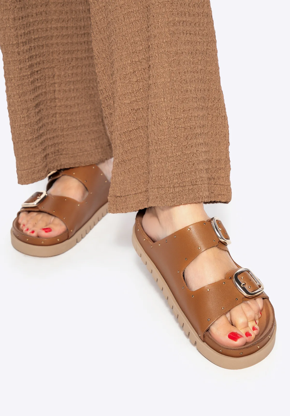 Leren slippers met plateauzool; stijl en comfort voor warme dagen. Licht, vrouwelijk en vol karakter: deze damesslippers zijn de perfecte keuze voor de zomer. Ze zijn in Spanje gemaakt van volnerfleer en combineren subtiele elegantie met zomerse casualness. Het unieke ontwerp wordt geaccentueerd door twee brede banden met metalen details die een onderscheidende touch toevoegen. Verstelbare gespen zorgen voor een perfecte pasvorm en de instapconstructie maakt ze gemakkelijk aan te trekken. De amandelvormige neus slankt de voet af, terwijl de zachte voering en het voetbed comfort garanderen bij elke stap. Voor wie? Als je waarde hecht aan comfort en stijl, zijn deze slippers de perfecte keuze. Ze zijn perfect voor lange stadswandelingen, zomervakanties en bijeenkomsten in de buitenlucht. Ze combineren prachtig met soepele jurken, linnen broeken of klassieke jeans. Onze tip: combineer ze met een schoudertas in een vergelijkbare kleur voor een samenhangende look. Voor een vleugje stijl kies je een shopper met metalen accenten die de sieraden van de sandalen complementeren. Belangrijkste kenmerken: Materiaal: Natuurlijk volnerf leer is een duurzaam en elegant materiaal dat zich perfect aanpast aan de voet en comfort garandeert, zelfs op warme dagen. Details: Decoratieve klinknagels voegen karakter toe en benadrukken de zomerse stijl. Instapmodel: Maakt snel aantrekken mogelijk en zorgt voor dagelijks comfort. Amandelvormige neus: Maakt de voet visueel slanker en voegt een vrouwelijke touch toe. Gemaakt in Spanje: Gegarandeerde topkwaliteit en vakmanschap. Comfortabele en functionele kenmerken: Zachte leren voering en binnenzool: Dempen elke stap en zorgen voor comfort, zelfs na langdurig dragen. Verstelbare bandjes: Twee gespen zorgen voor een perfecte pasvorm en stabiliteit. Plateau met gevormde zool: Garandeert een zachte lift, stabiliteit en comfort gedurende uren. Klaar voor de zomer? Kies onze schoenen die modieus design en comfort combineren. natuurlijk leer natuurlijk leer synthetisch materiaal