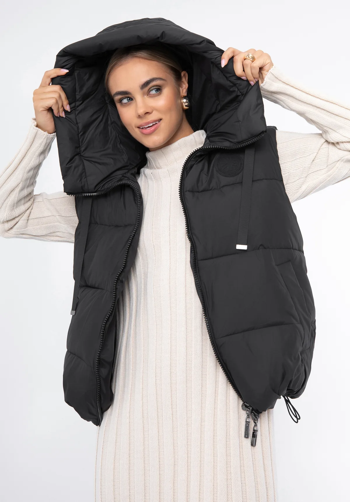 Gewatteerd damesvest Dit unieke vest beschermt je tegen de kou op koudere dagen. Het oversized design in klassieke kleuren verbetert elke outfit, of het nu een getailleerde jurk is of je favoriete dikke trui en jeans. Gemaakt van polyester, voelt de wattering ongelooflijk zacht aan. De vaste capuchon kan worden aangetrokken met trekkoorden om je hoofd en nek nauwsluitend te wikkelen. Dit oversized gewatteerde damesvest is een tijdloos accessoire met een twist dat een nieuwe stijl aan je garderobe toevoegt. Onze tip: je kunt dit vest ook over een licht jasje dragen. Samenstelling: 100% polyester; vulling: 100% polyester; voering: 100% polyester; met capuchon; capuchon met trekkoorden; oversized pasvorm; ritssluiting; drukknoopsluiting aan de zijkanten; gewatteerd; verborgen trekkoord op de heupen.