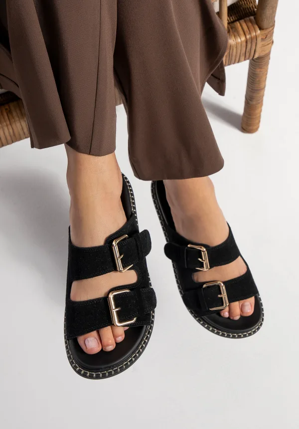 Wittchen - Zwarte Sude Teenslippers - Verstelbare Bandjes - Platte...