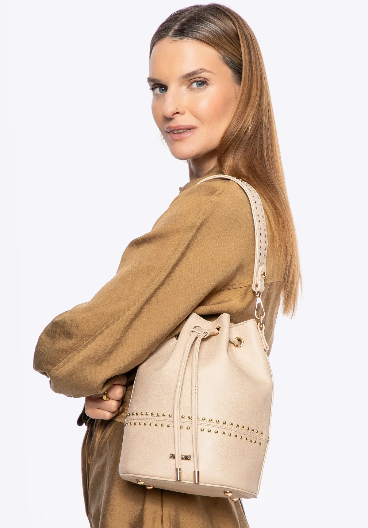 Boho elegantie; Bucket bag met glanzende klinknagels. Combineer boho-stijl met functionaliteit met deze unieke bucket bag. De opvallende vorm wordt gekenmerkt door glanzende klinknagels die het handvat en de voorkant versieren, wat hem een onderscheidende, modieuze look geeft. De tas sluit met een trekkoord en heeft praktische vakjes aan de binnenkant, waardoor hij de perfecte keuze is voor zowel dagelijkse uitjes als avondvergaderingen. Een afneembare, verstelbare riem stelt je in staat de tas aan te passen aan jouw behoeften, terwijl vier metalen voetjes aan de onderkant hem beschermen tegen vuil. Voor wie? Perfect voor vrouwen die waarde hechten aan een boho-stijl, maar niet willen inleveren op functionaliteit. Deze tas zal zeker in de smaak vallen bij diegenen die graag mode combineren met functionaliteit; perfect voor dagelijkse uitjes, winkelen of een afspraak met vrienden. Onze tip: Deze tas combineert prachtig met losse jurken, leren jassen of casual jeans. De boho-stijl geeft hem een uniek karakter, waardoor je opvalt. Belangrijkste kenmerken: Materiaal: Gemaakt van duurzaam eco-leer, wat zorgt voor een elegante look en gemakkelijk onderhoud. Glanzende klinknagels: Klinknagels op het handvat en de voorkant van de tas geven hem originaliteit en een onderscheidend karakter. Trekkoorden: Functionele sluiting die snelle toegang tot het interieur biedt en uw bezittingen beschermt. Praktische vakken: Binnenin de tas bevinden zich twee doordachte vakken, waaronder een ritsvak, perfect voor uw telefoon, portemonnee en sleutels. Samenstelling: 100% eco-leer; voering: 100% polyester. Comfortabele en functionele kenmerken: Verstelbare riem: Dankzij de mogelijkheid om de riemlengte aan te passen, kunt u de tas comfortabel dragen volgens uw voorkeuren, ook als een crossbody. Afneembare handgreep: U kunt de tas op twee manieren dragen: in uw hand of met de afneembare schouderriem, voor comfort en flexibiliteit. Vier metalen poten: Beschermen de onderkant van de tas tegen vuil en krassen. Kies deze tas en geniet niet alleen van een modieus accessoire, maar ook van functionaliteit die uw dagelijks leven gemakkelijker zal maken!