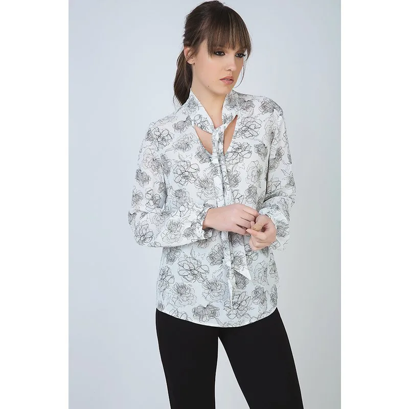 Geef je garderobe een boost met onze chique witte blouse, versierd met een verfijnde bloemenprint. Deze top is gemaakt van zachte, ademende 100% viscose en heeft een opvallende uitgesneden kraag, een glad ontwerp met knoopsluiting en veelzijdige lange mouwen met verstelbare manchetten met knopen. De ontspannen pasvorm zorgt voor comfort en elegantie voor elke gelegenheid. Deze blouse is gemakkelijk te onderhouden en past naadloos bij zowel casual als formele kleding.