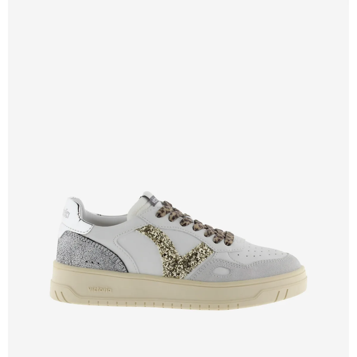 Witte leren look sneakers met een suède neus. Detail in de vorm van een raam aan de zijkant. Ze komen ook met het logo van victoria aan de zijkant in glitter en de achterkant in metallic tinten. Sluiting met dierenprint veters. De neus is geperforeerd om zodoende de ademhaling te bevorderen. TPR zool, licht getoast.