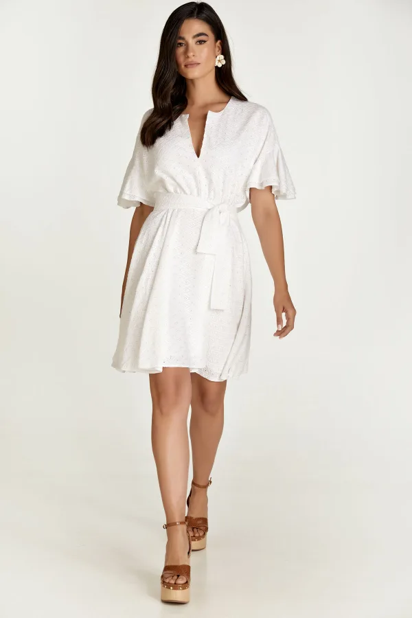 Deze witte jurk is gemaakt van geweven viscose stof en is ton sur ton geborduurd. Het heeft korte mouwen met dubbele ruches en hangende schouders. Het heeft een ronde halslijn met een V-opening aan de voorkant. Onder de buste is een gebogen naad waaronder de jurk uitloopt in een clochestijl. Aan de binnenkant zit een verborgen ritssluiting waardoor de jurk gemakkelijk kan worden aangetrokken. De jurk is gevoerd. De jurk kan worden gedragen met of zonder de ceintuur, die in dezelfde stof is vervaardigd. De riem is inbegrepen.