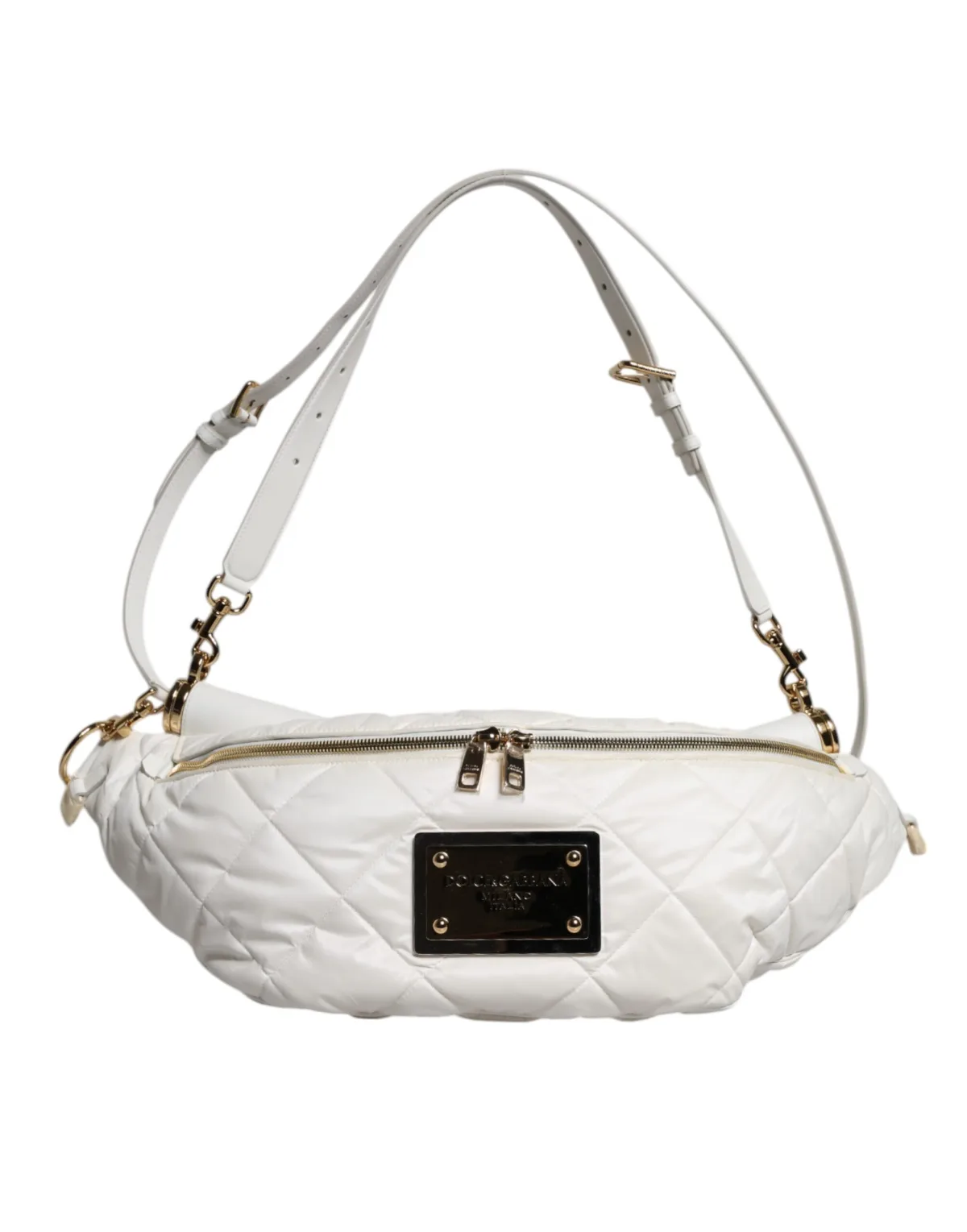 DOLCE & GABBANA Prachtige gloednieuwe, 100% Authentieke Dolce & Gabbana witte met een gewatteerde afwerking gouden logo-plaat met tweeweg-rits, afneembare verstelbare tailleband, platte handvatten, hoofdcompartiment, interne patch pockets, interne ritsvak. Model: Heuptas Kleur: Wit met gouden hardware Materiaal: Polyester 70%, Nylon 15%, Kalfsleer 10%, Polyurethaan 5% Band: Verstelbare tailleband Rits sluiting Logo gegraveerd metalen hardware Geschikt voor Italië Afmetingen: 49cm x 29cm x 1cm Band: 116cm