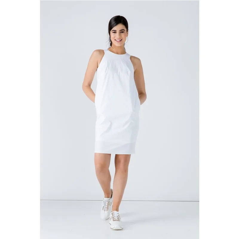 Zomerse zakjurk van witte geweven stof, 100% crushed cotton. Ronde hals en mouwloos. Darts op de borst en 2 zijzakken. Verborgen ritssluiting achteraan, toon op toon. Ons model is 172cm en draagt maat 36/S. Afmetingen voor maat 36 (in cm): Schouder -28; Borst-45; Taille-49; Onderkant-52;Lichaamslengte-94. 100% KATOEN