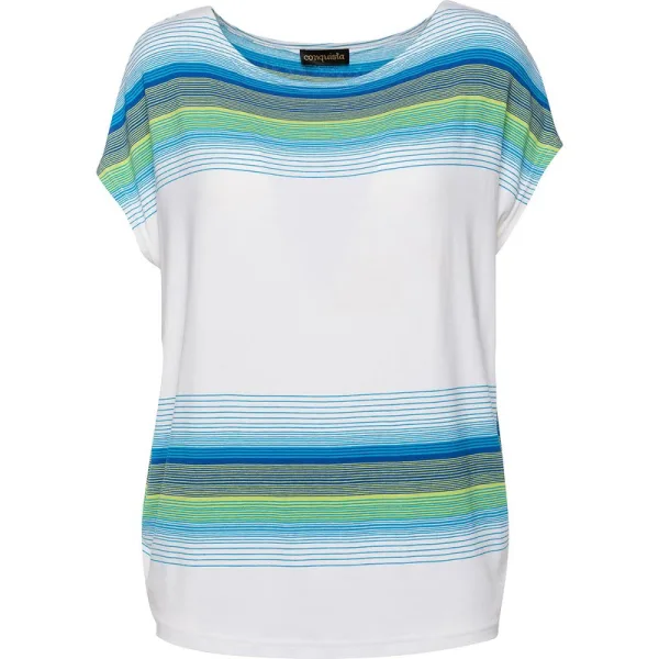 Witte zomertop van stretch jersey: viscose-elastan. Gestreepte meerkleurige print aan de voorzijde. Mouwloos en een boothals. Los silhouet. Afmetingen voor maat 38/M (in cm):Schouderbreedte-60, Buste-60, Taille-60, Zoomlijn-48, Lichaamslengte-65. 92%viscose-8%elastan