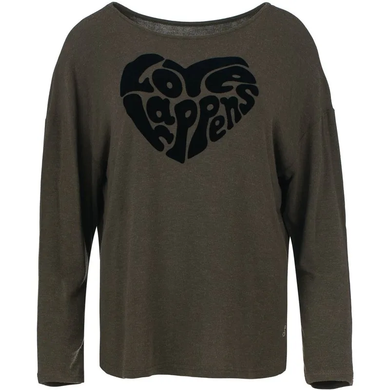 Deze top is gemaakt van een elastische viscose-wolmix. Het heeft een ronde hals en lange vleermuismouwen. Er is een flockmotief aan de voorkant en er zitten strass-steentjes linksonder. De zoom is asymmetrisch en er zijn kleine splitjes aan de zijkanten. De top heeft een los silhouet.