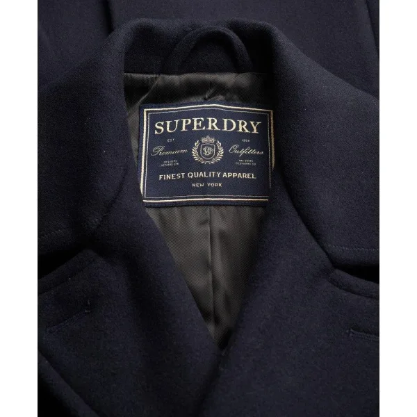 Relaxed pasvorm - de klassieke Superdry pasvorm. Niet te smal, niet te ruim, precies goed. Kies je normale maat Medium schouder tot zoom: 82 cm Zware stof van wolmix Dubbele knopenrij Op maat ontworpen knopen met nautische details Twee buitenzakken met paspel Twee binnenzakken Split aan de achterkant Premium twill voering Superdry patch aan binnenzak Onze Wollen Pea Coat is het toonbeeld van minimalistische, strakke mode. Moeiteloos ontworpen om het lichaam te volgen in een getailleerd maar comf