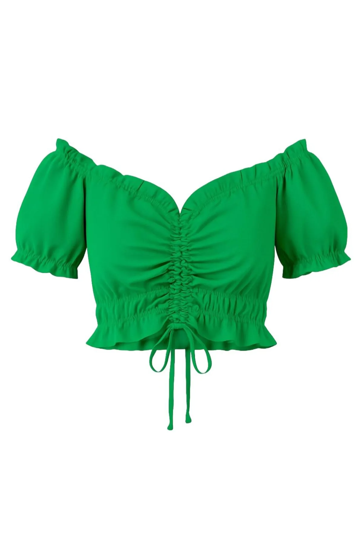 Blouse type: Blouseshirt; Design: Pofmouwen; Motief: Effen; Details: Ruches, Gedrapeerd; Extra's: Op staal naden; Pasvorm: Slanke pasvorm; Armlengte: Kwartmouw; Lengte: Korte pasvorm