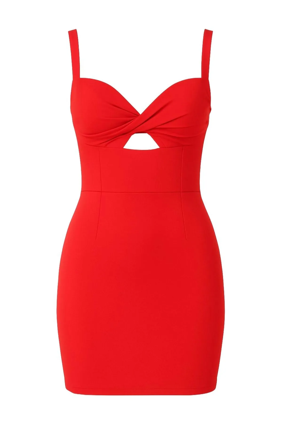 Design: Diepe snit/decolleté; Type sluiting: Ritssluiting; Motief: Effen; Soort bandjes: Spaghettibandjes; Details: Cut-outs, Gedrapeerd; Extra's: Op staal naden; Lengte: Kort/mini; Snit: Getailleerd; Pasvorm: Slanke pasvorm; Armlengte: Mouwloos