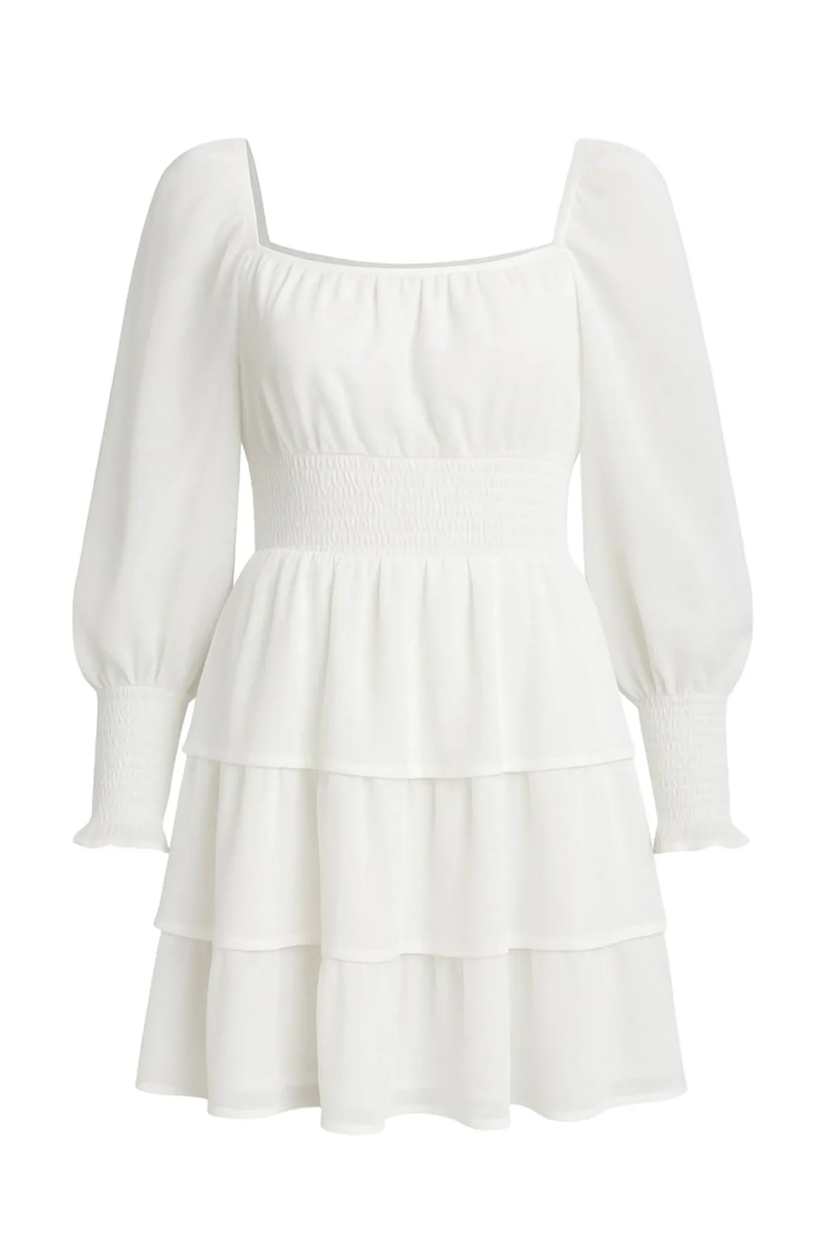 Design: Flare; Materiaal: Chiffon; Halstype: Carmen hals; Motief: Effen; Details: Ruches, Volant, Gedrapeerd; Extra's: Gladde stof; Lengte: Kort/mini; Snit: Getailleerd; Pasvorm: Normale pasvorm; Armlengte: Lange mouw