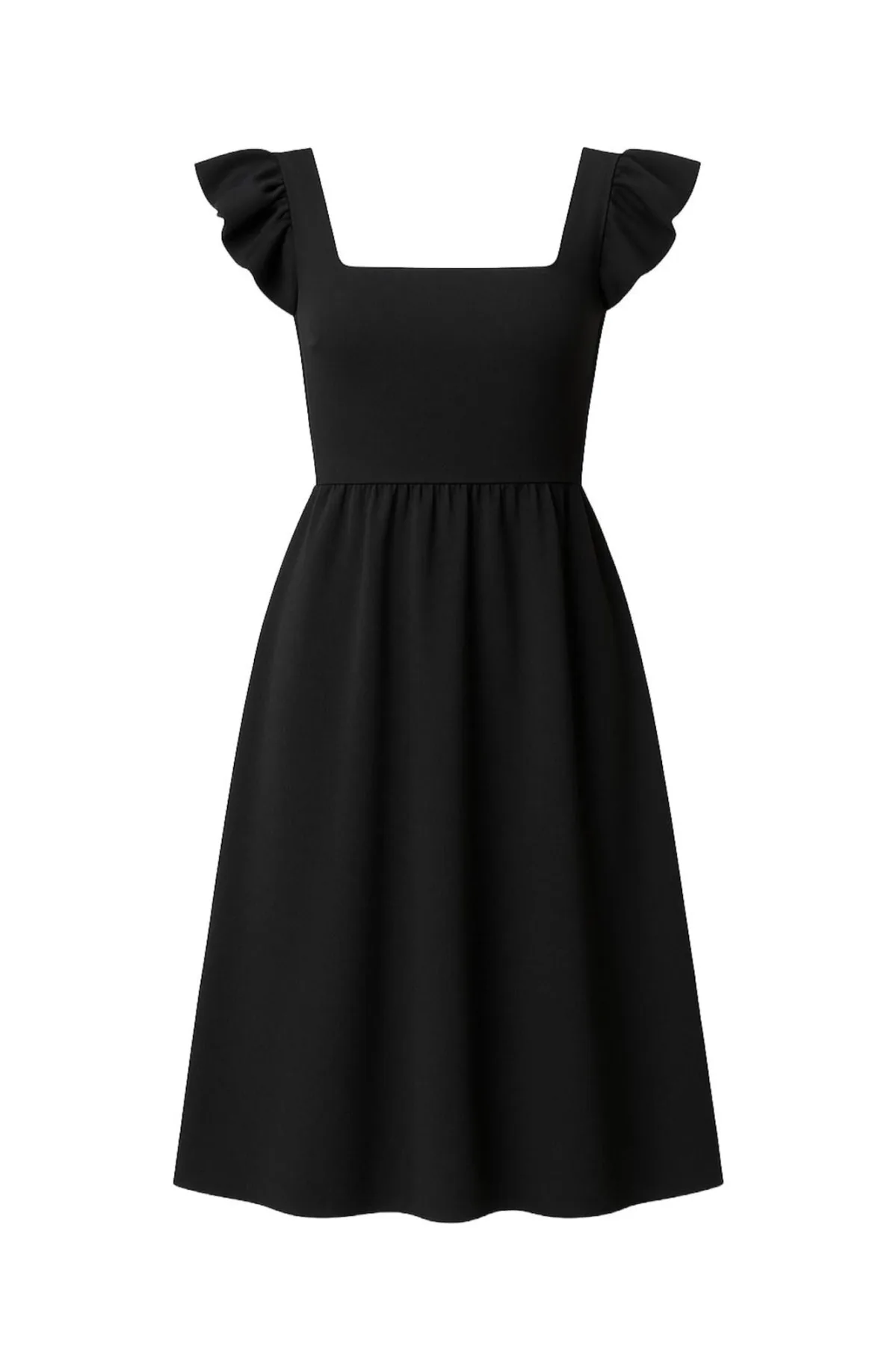 Design: Gevoerde zoom/rand; Halstype: Carréhals; Motief: Effen; Details: Volant; Extra's: Op staal naden; Lengte: Knielengte; Pasvorm: Normale pasvorm; Armlengte: Kwartmouw