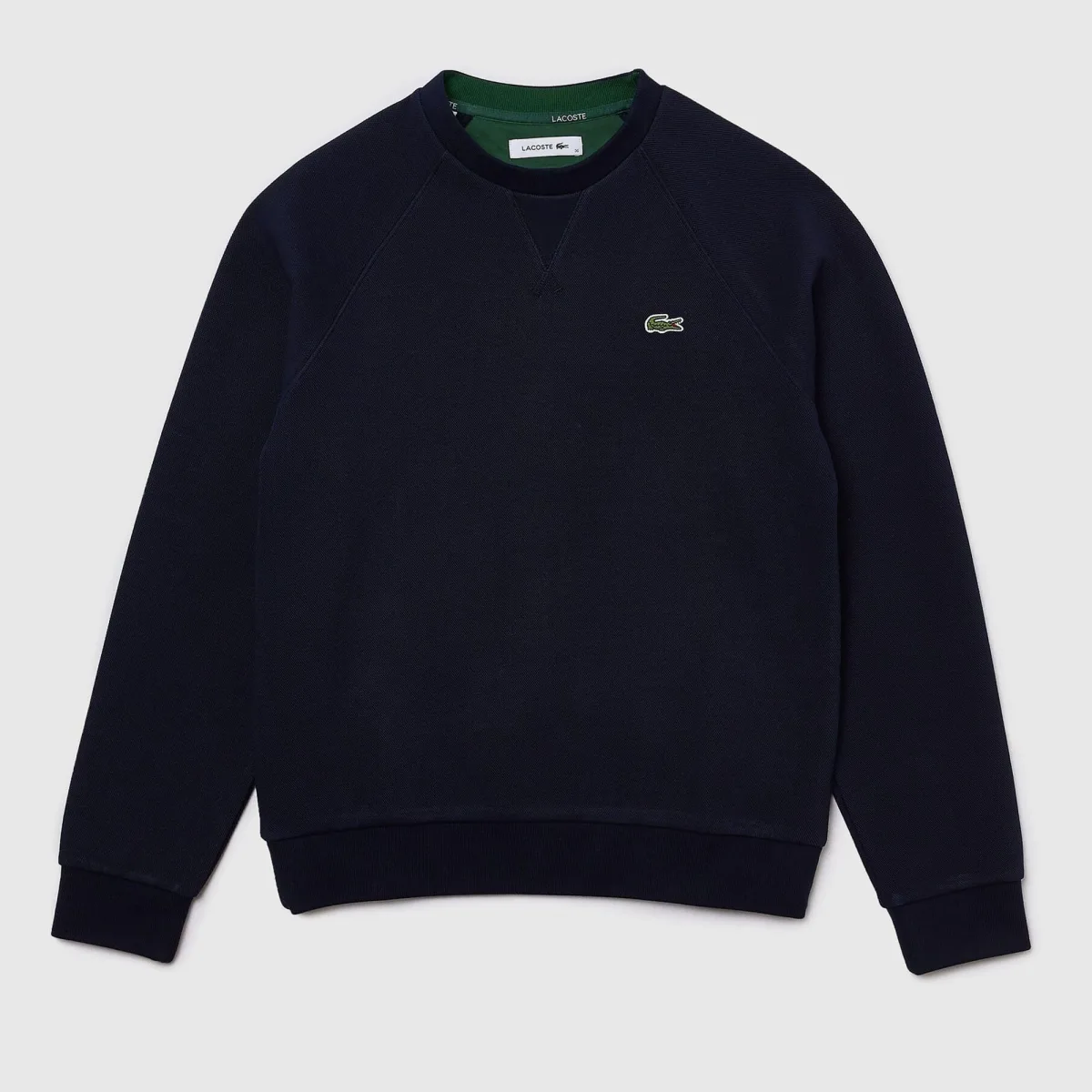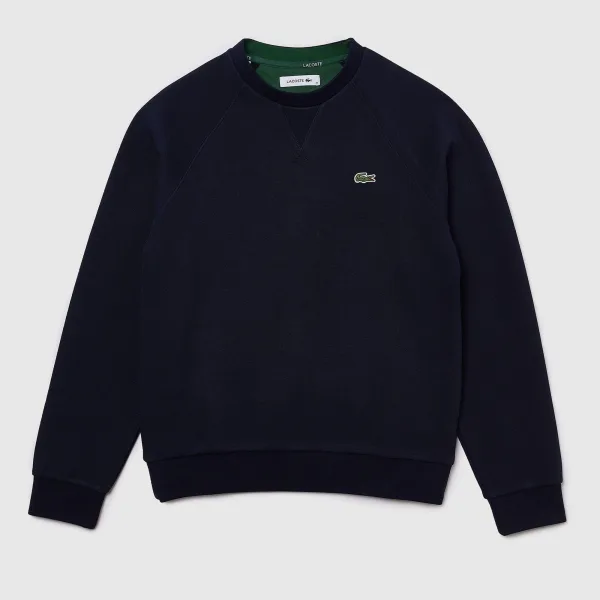 Womens Lacoste Crewneck Sweatshirt in navy.- Ribbed crewneck.- Ribbed cuffs and hem.- Signature green piqué internal neckband.- Embroidered crocodile on chest.- Soft cotton fleece.- Classic fit.- 84% Cotton 16% Polyester.- Ref: SF707300166