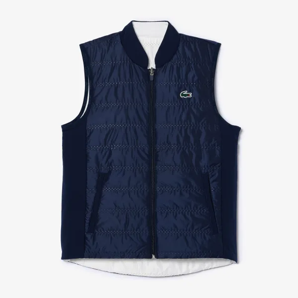 Womens Lacoste Golf Gilet in navy.- Quilted effect on front.- Reversible with pockets and side splits.- Quilted effect on front.- Silicone crocodile logo.- Showerproof taffeta on front diamond taffeta on sides.- Water-repellent properties.- Slim fit longer at the back.- Recycled polyester taffeta exterior with recycled polyester filling.- Ref: BF486400HHW