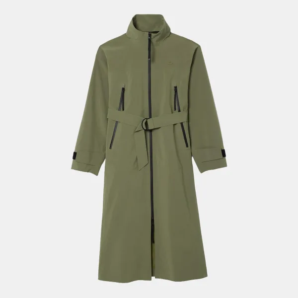 Womens Lacoste Long Oversized Water-Repellent Parka Jacket in khaki.- High stand-up collar and a pack-away hood.- Double-ended zip closure.- Two zipped pockets on the sides.- Removable belt.- Signature silicone crocodile logo is on the chest.- Water-repellent properties waterproofed seams.- Oversized cut.- It is made from a blend of 88% polyester and 12% elastane a double-face waterproof stretch fabric.- Ref: BF326500BMY