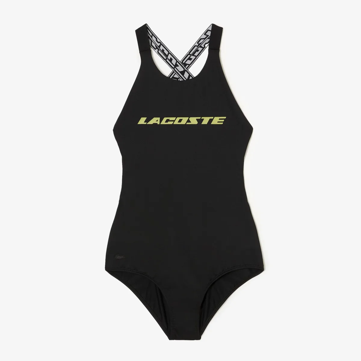 Womens Lacoste One Piece Swimsuit in black.- Open back.- Crossover straps.- Yellow-green Lacoste print on the chest.- Silicone crocodile badge.- Lined at front.- 75% Polyester 25% Elastane.- Ref: MF776400031