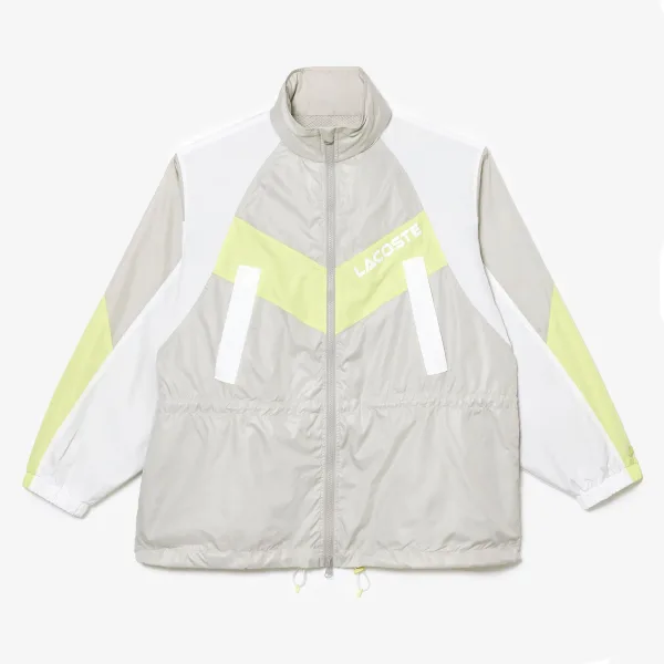 Womens Lacoste Oversized Hooded Colourblock Jacket in grey.- High neck with a concealed hood.- Full zip fastening.- Two side welt pockets and an inside pocket.- Elasticated cuffs and hem.- Adjustable waist.- Grey white and yellow colour-block design.- Lightweight and water-repellent windbreaker.- Water-repellent recycled polyester taffeta with a breathable mesh lining.- Ref: BF156700IZB