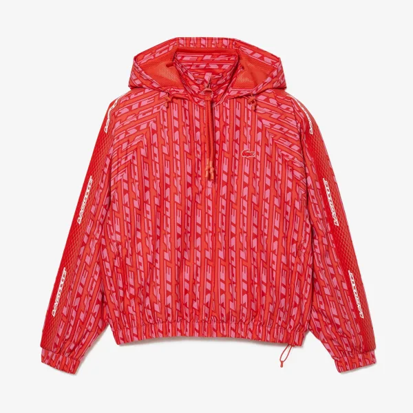 Womens Lacoste Oversized Hooded Track Jacket in orange.- Hood with a drawstring and a zipped closure.- Dropped shoulders.- Zipped pockets.- All-over Lacoste print.- Silicone crocodile logo is on the chest.- The sleeves feature a printed silicone stripe with a texture effect.- Water-repellent fabric with a mesh lining.- Oversized generous cut.- Ref: BF641200ZI1