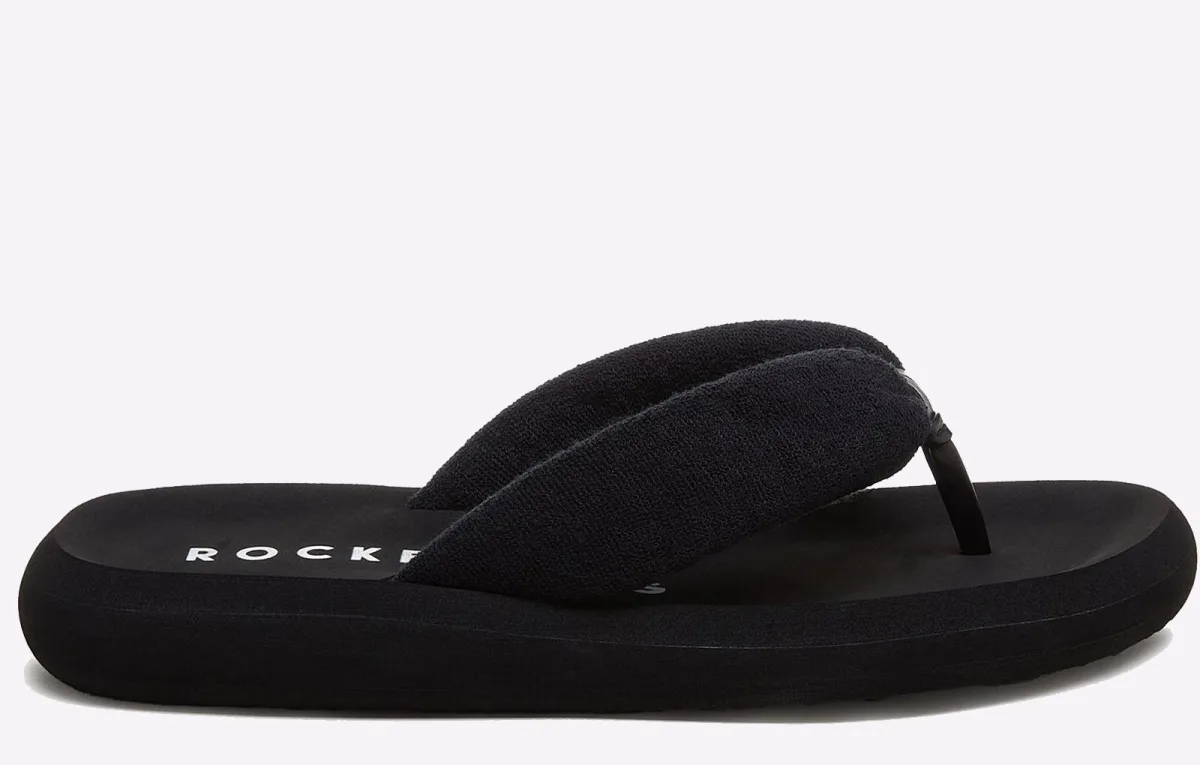 Womens Rocket Dog Sunset Puff Flip Flops in black.- Plush black terry cloth straps.- Slip on fastening.- Black EVA footbed.- Printed branding.- EVA footbed.- Synthetic sole.- Ref: SUNSETPUFF2