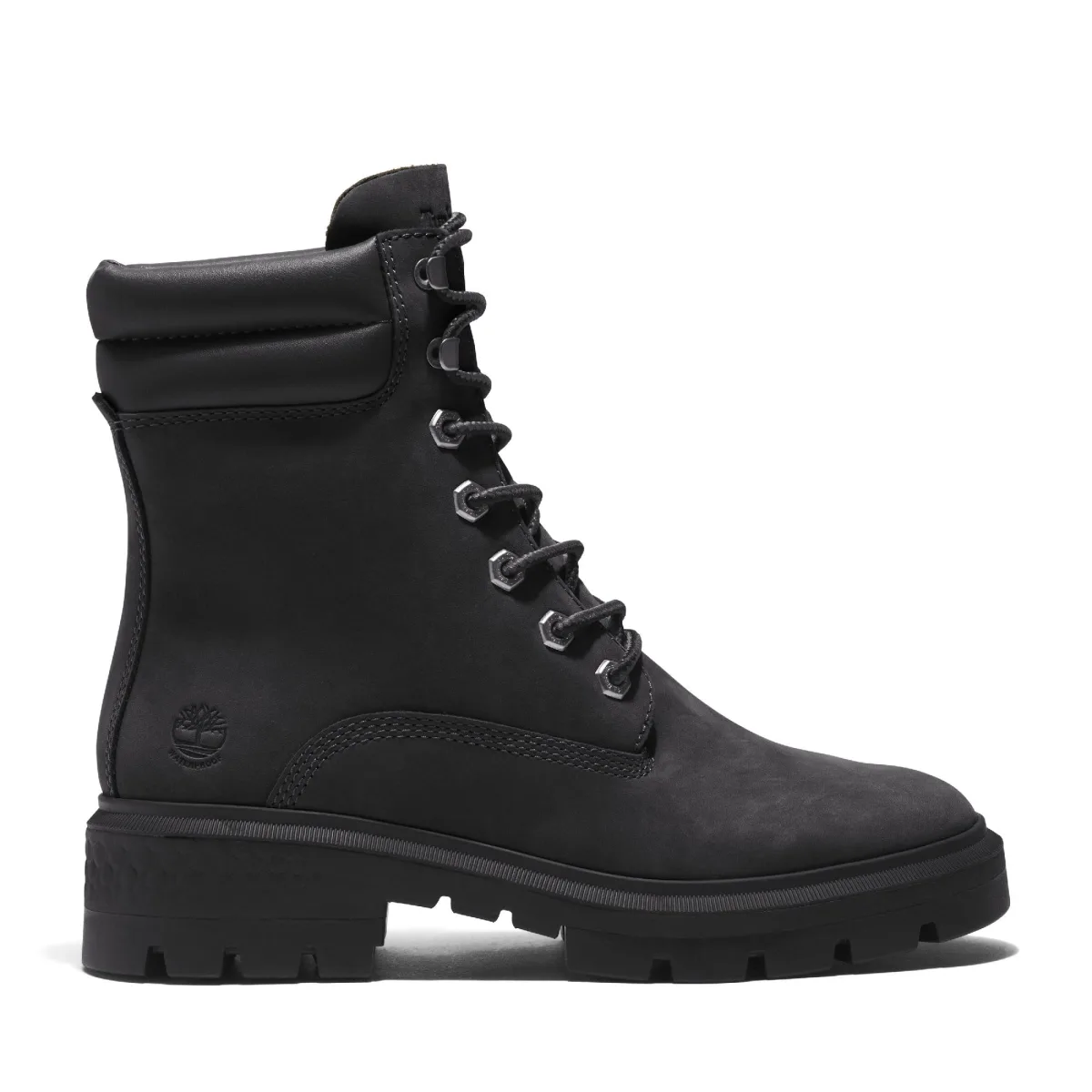 Womens Timberland Cortina Valley Mid-Lace Up Waterproof Boot in black.- Premium waterproof Timberland® nubuck leather upper.- Lace-up style.- Padded collar.- GreenStride™ midsole.- ReBOTL™ fabric made from at least 50% recycled plastic.- Chunky cleated rubber sole.- Ref: TB1A5NBY0151